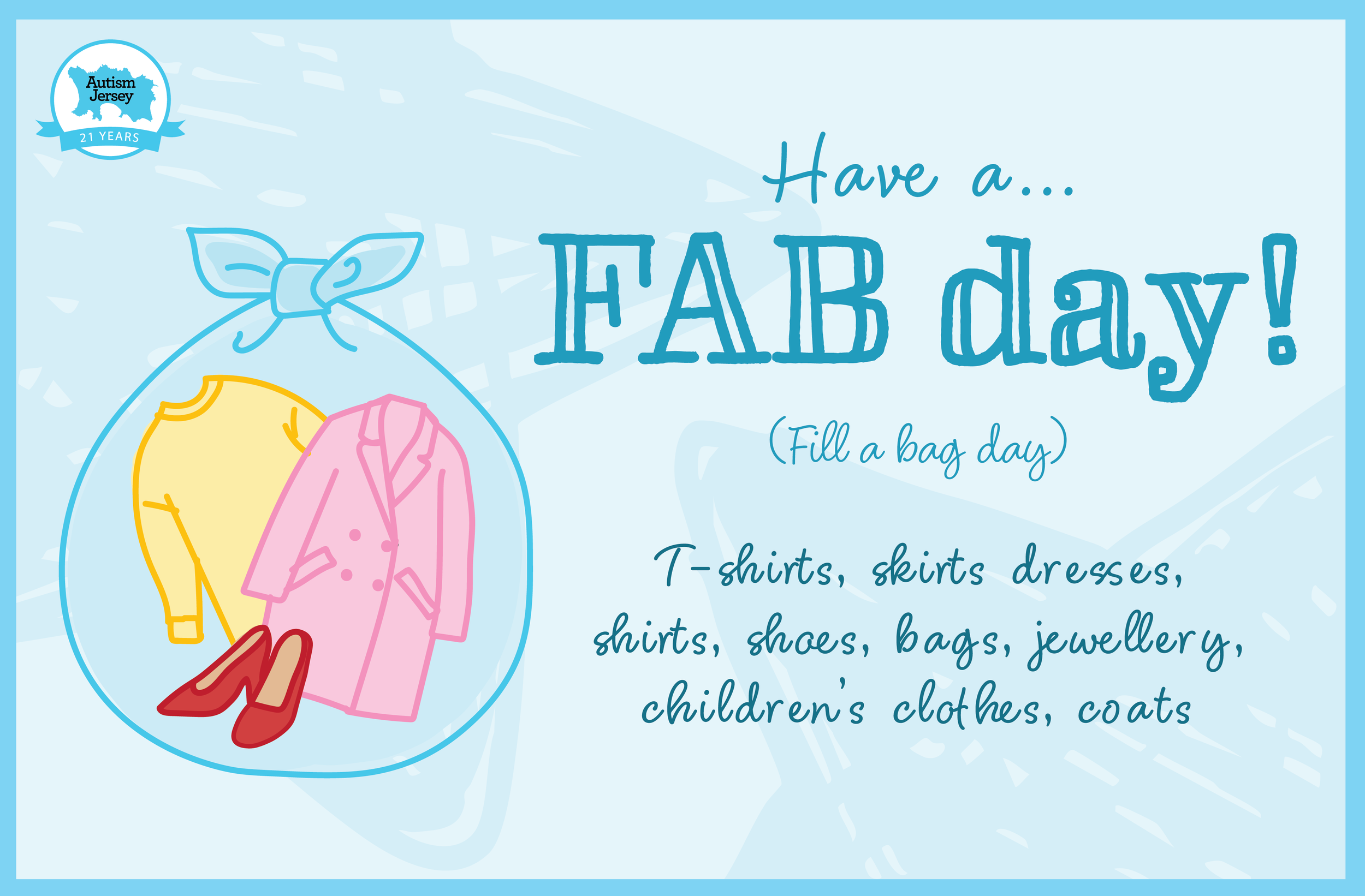 We love good-quality, stylish clothing and accessories (please note that we cannot accept furniture or electrical items at this time) and we’re asking supporters to arrange or host a "FAB day", fill a bag day!